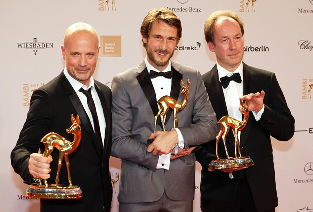 Den Publikums-Bambi gewinnt der TV-Mehrteiler „Der Mann mit dem Fagott“, die die Familiengeschichte von Musiker und Entertainer Udo Jürgens erzählt. Die Schauspieler Christian Berkel (v. l.), David Rott und Ulrich Noethen freuen sich über die Auszeichnung.