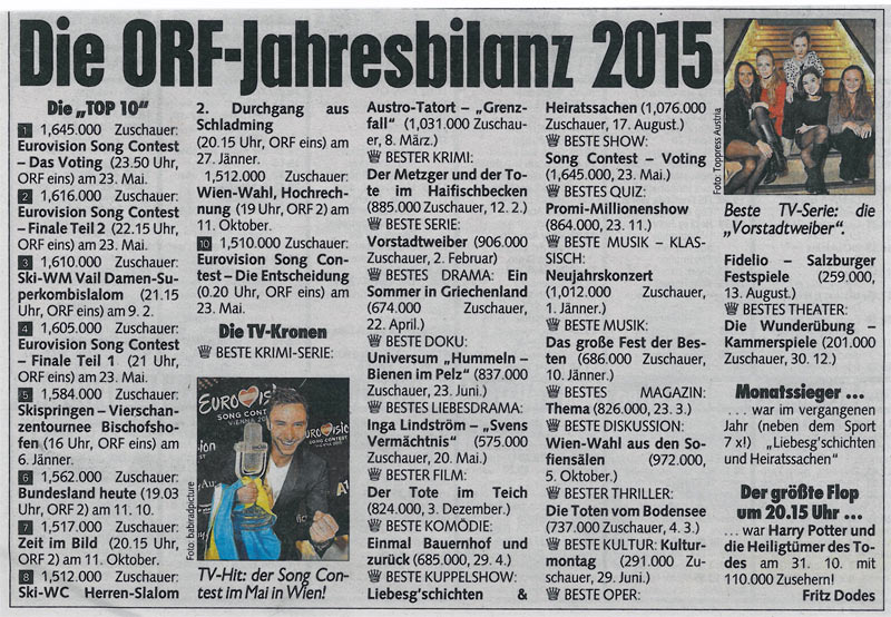 Die Kronen Zeitung (auflagenstärkste Tageszeitung in Österreich) hat über das abgelaufene Fernsehjahr ein Ranking über die ORF-Jahresbilanz 2015 erstellt. Es ist sehr erfreulich, dass unser Film „Die Toten vom Bodensee – Familiengeheimnis“ als Bester Thriller des Jahres 2015 eingestuft wurde.