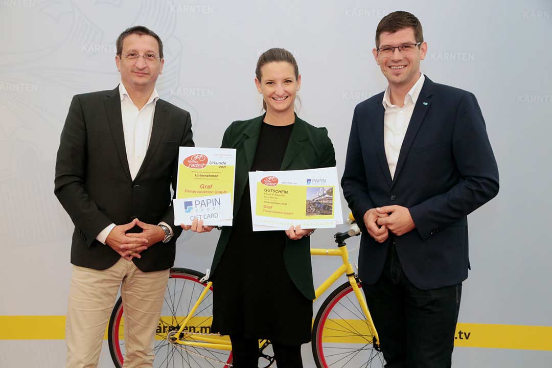 Unser fleißiges „Ins Büro Radeln“ hat sich ausgezahlt: In der Kategorie Unternehmen wurde die Graf Filmproduktion GmbH im Rahmen der Aktion „Kärnten radelt“ für unser Enagement, klimafreundliche Mobilität im Betrieb zu fördern, geehrt.