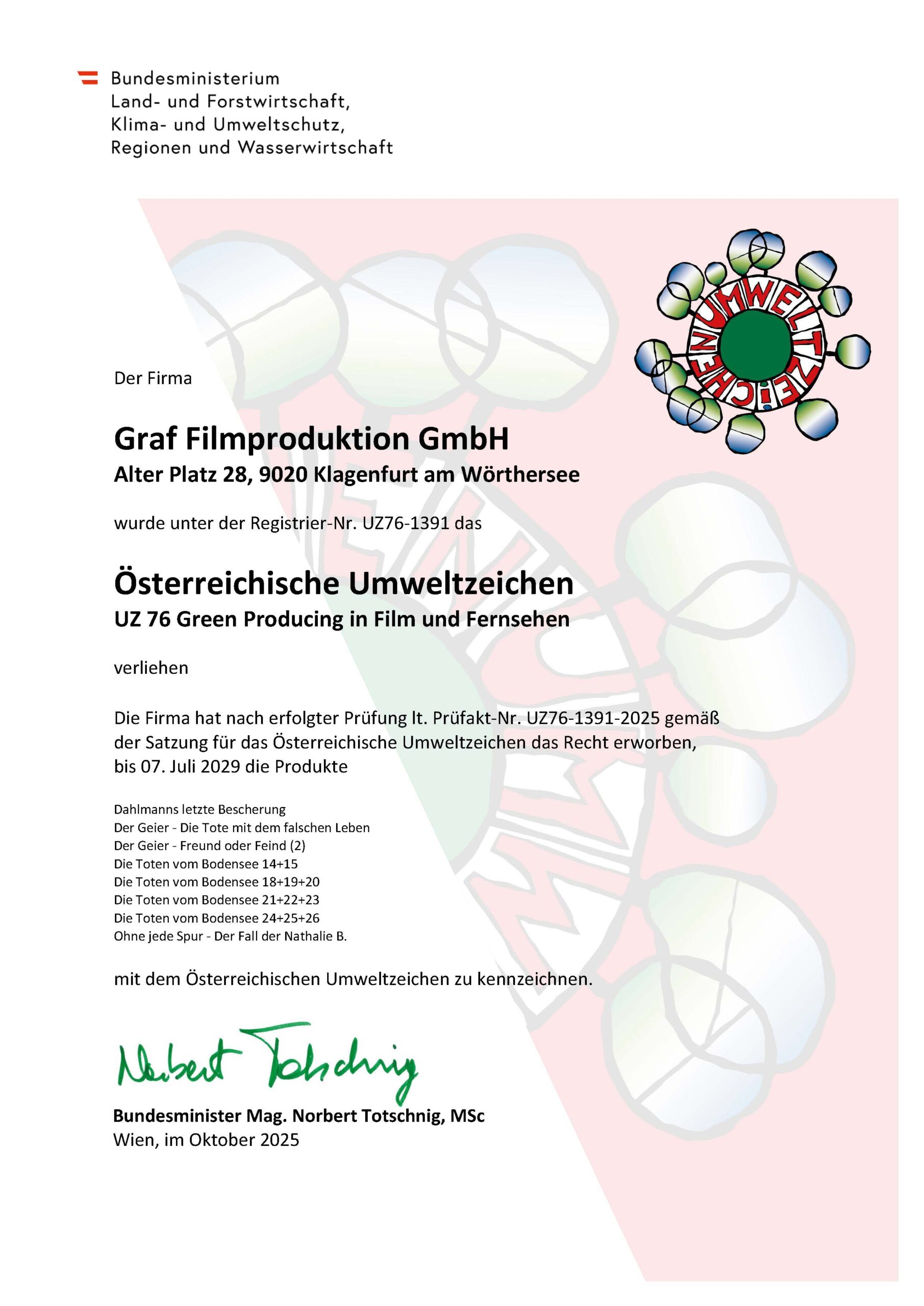 Diese Zertifizierung steht für besonders umweltfreundliche und ressourcenschonende Produktionsweisen und ist ein offizieller Nachweis, dass aktiver Klima- und Umweltschutz in den Filmproduktionsalltag integriert wurden. Das Österreichische Umweltzeichen wird vom Bundesministerium für Klimaschutz vergeben und gilt als eines der wichtigsten Nachhaltigkeitssiegel im deutschsprachigen Raum. Die Graf Filmproduktion GmbH ist seither Lizenznehmer des Österreichischen Umweltzeichens und bisher sind acht Filmproduktionen nach dem UZ 76 zertifiziert (Stand: 17.11.2025). Der aktuelle Zeichennutzungsvertrag für das Österreichische Umweltzeichen ist bis 7. Juli 2029 gültig.